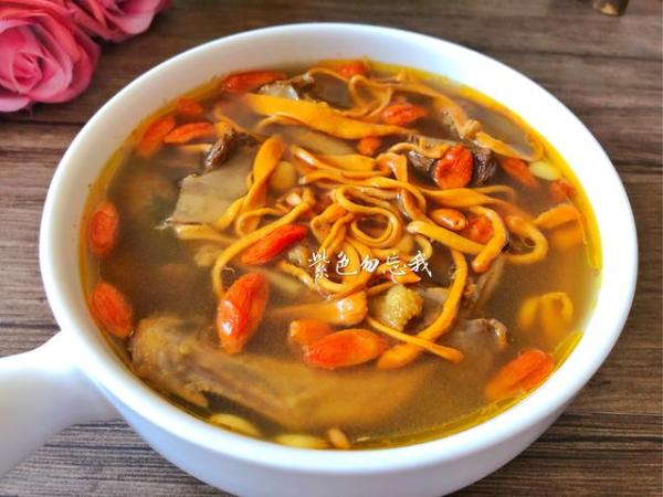 做法:全部食材处理好洗净,鸽子焯水洗净,除枸杞以外的所有食材,全部放入砂锅里,大火煲20分钟,转文火煲2个小时,再放入盐调味,再加入枸杞即可。