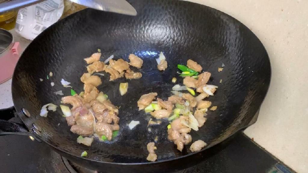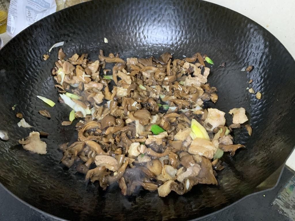 4、锅中倒入油,油热之后放入肉片炒至发白,然后再放入葱姜炒香,然后放入处理好的蘑菇,将蘑菇翻炒均匀