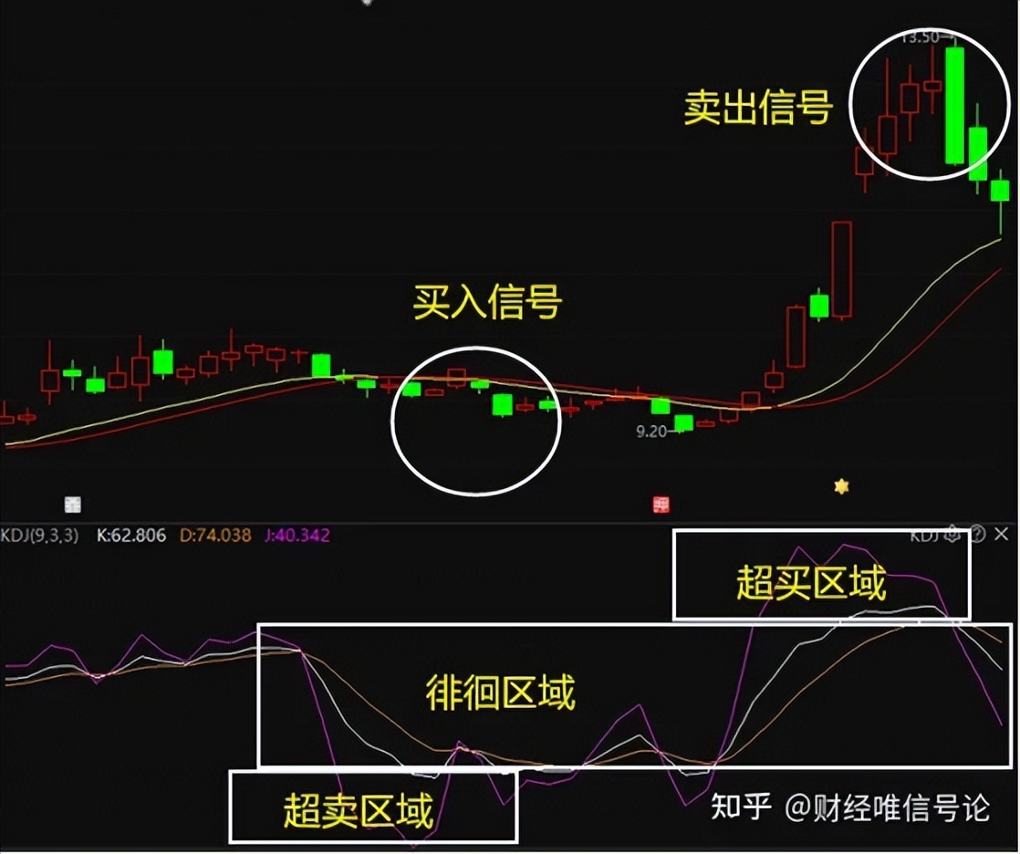 根据KDJ的取值,可将其划分为几个区域,即超买区,超卖区和徘徊区。按一般划分标准,K、D、J这三值在20以下为超卖区,是买入信号;K、D、J这三值在80以上为超买区,是卖出信号;K、D、J这三值在20-80之间为徘徊区,宜观望。(如下图所示)
