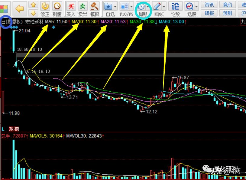 如下图:在“周期”里面可以选择要分析的级别,每个颜色代表的是箭头上方的几日均线。