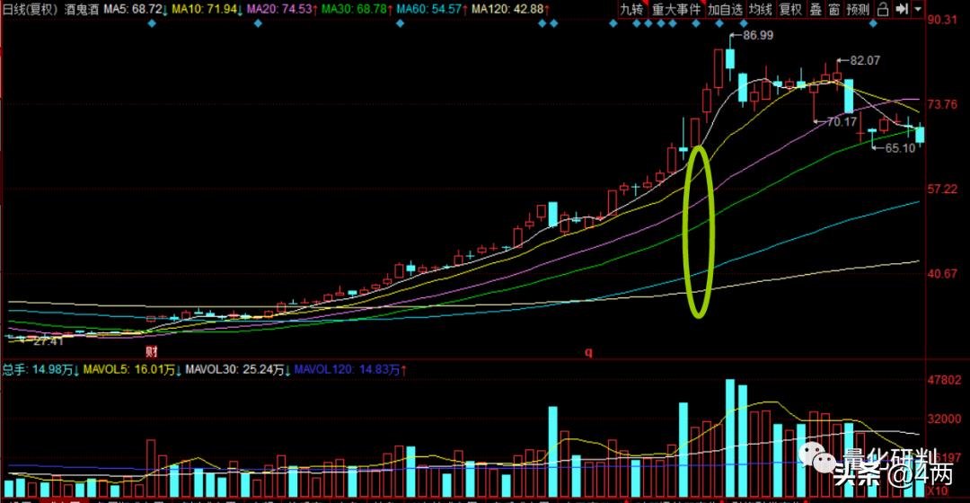 一、多头排列,盘面图形中,短期均线、长期均线依次向上排列,例如5日、10日、20日、60日均线向上依次排列,说明现在股价处于上升趋势中,一般出现在抱团白马股或受政策行业重大利好刺激的股票中,如下图: