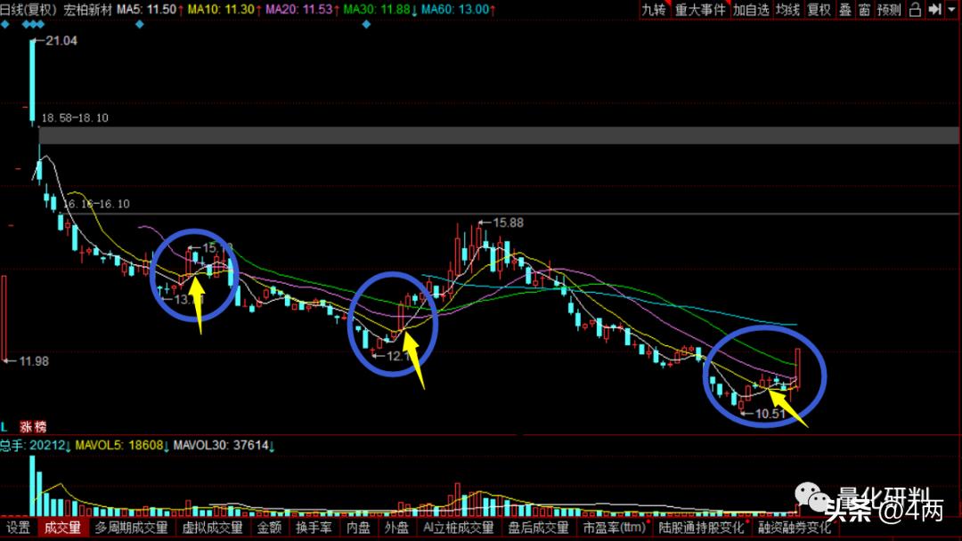 三、金叉,是指某条均线从下往上穿过另一条均线,通常是看多的信号,比如5日均线金叉10日均线,表明股价短期止跌,有向上拐头的趋势,但是如果其他的中长期均线仍然是下跌趋势(空头排列中),短均线的金叉可能只是下跌中继的小反弹而已,所以要根据具体位置研判能否介入。如下图:
