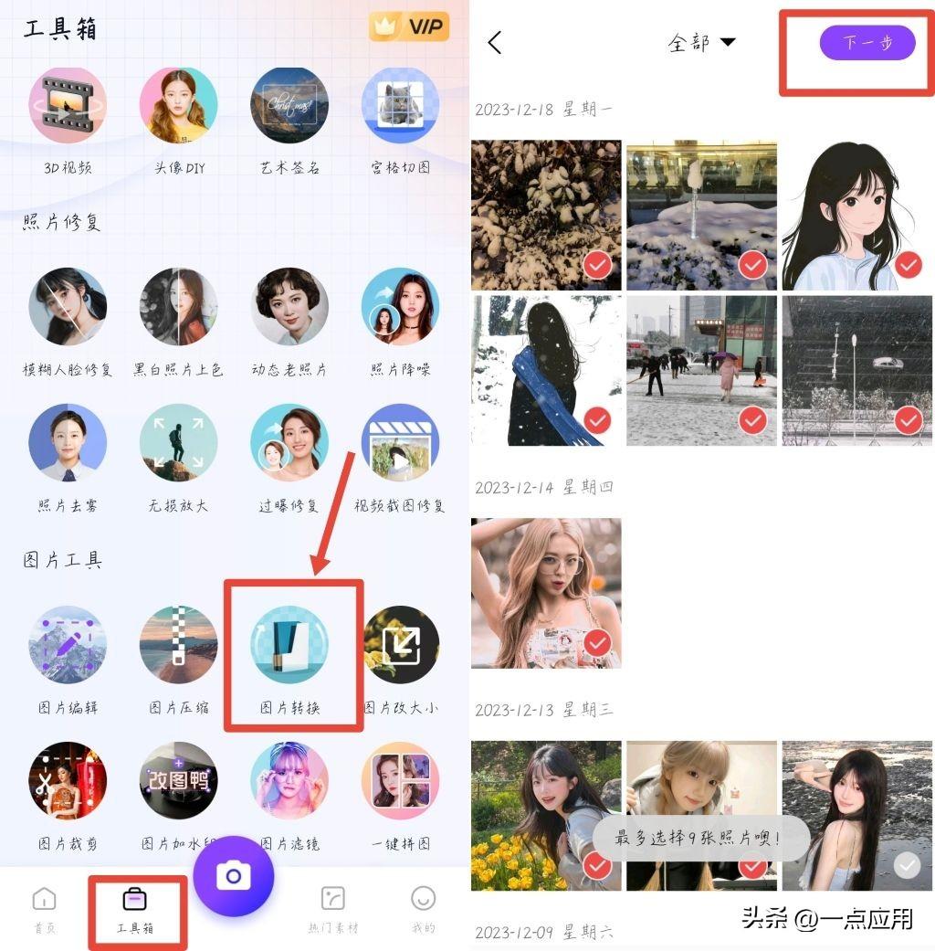 打开后点击底部的“工具箱”,接着在自动跳转页面找到并选择“图片工具”下的【图片转换】进行图片导入,一次可选择九张。