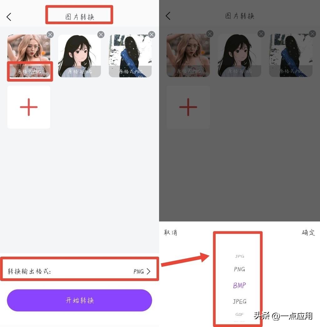 上传成功后会直接显示图片原格式,接着可选择设置转换输出格式,内置JPG、PNG、GIF、BMP等十种常见格式,按需选择后点击“开始转换”。