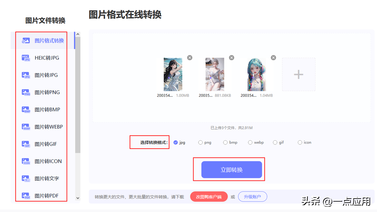 可选择相应的转换类型添加图片,也能在上传图片后设置输出格式,多种不同格式的图片还能批量转换成指定格式,点击“立即下载”即可保存转换好的图片了。