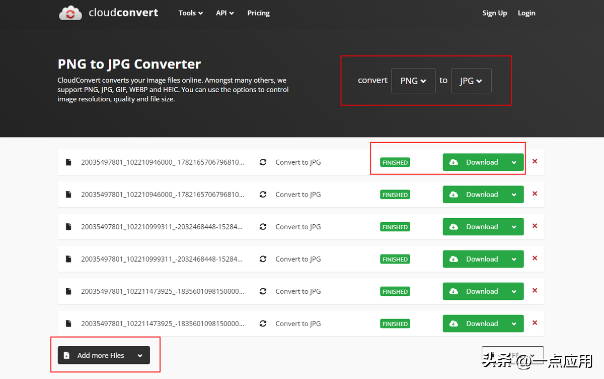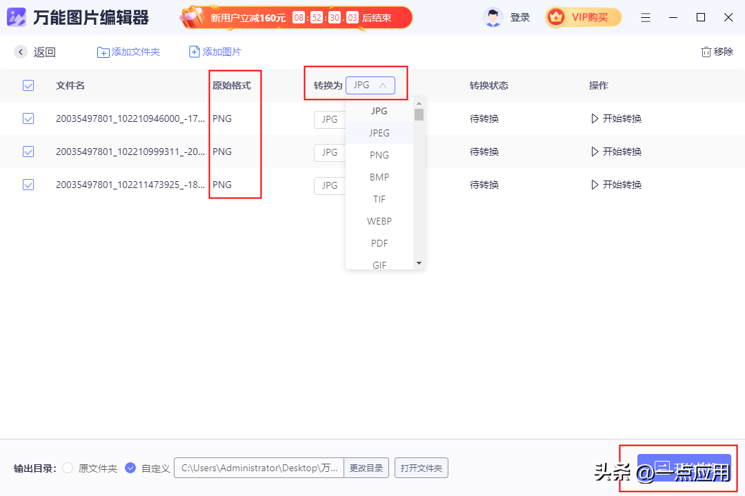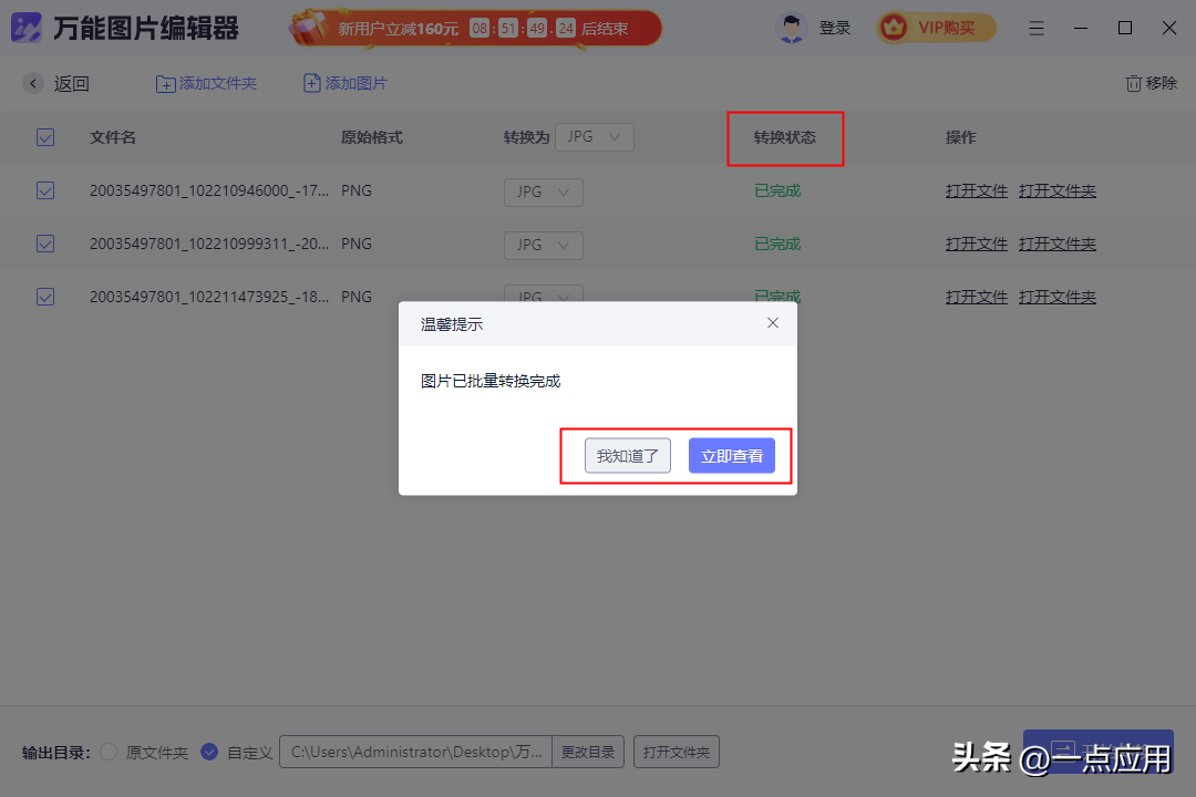 上传后会自动显示图片原始格式,选择好转换格式后点击“开始转换”就能一键实现所有图片格式转换,速度很快,待状态栏显示“已完成”就能立即查看了。