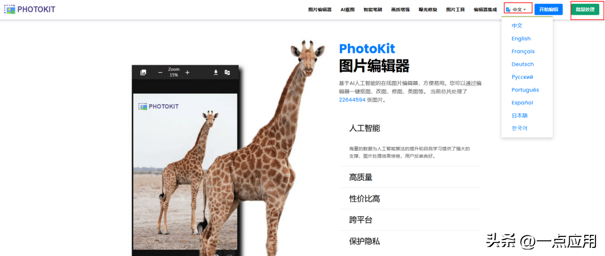 一个强大的在线图片编辑器,支持切换页面显示语言,一键抠图、改图、修图、美图都能搞定,并且内置正版高清图片素材库,帮助轻松应对各种设计场景。