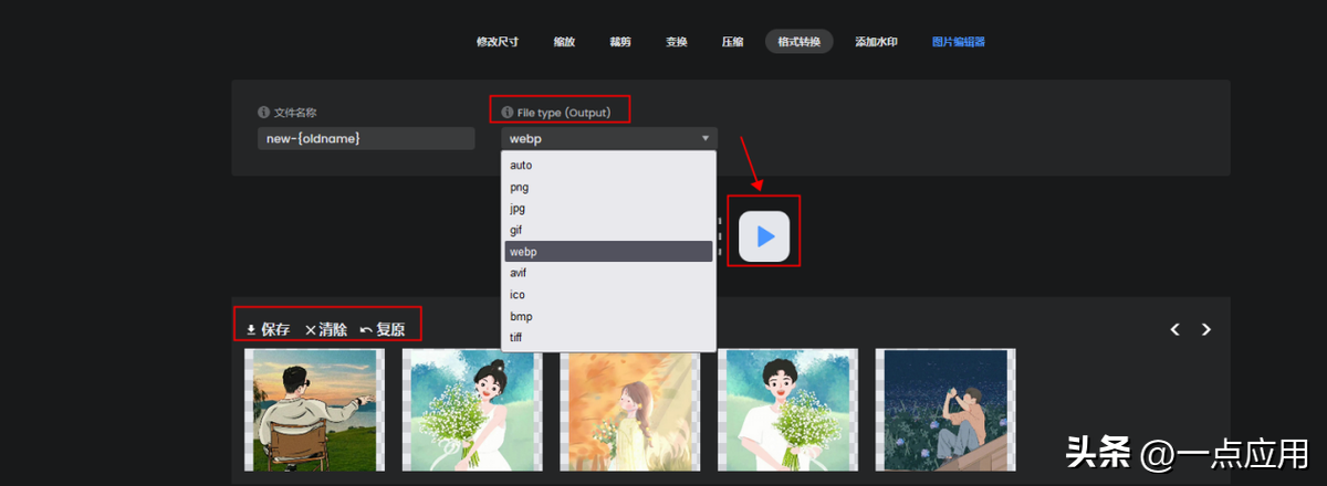 可一次性选择多张导入,内置九种常见的图片格式,背景色支持自定义,转换完成后还能进行保存、清除和复原处理。