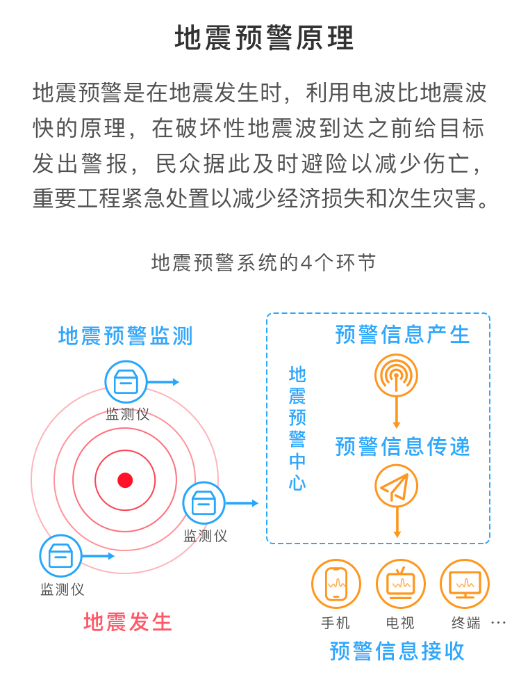 地震会产生地震波,地震预警就是地震发生时,仪器检测到地震波,利用电波比地震波快的原理,在破坏性地震波到达前,对用户发出警报。