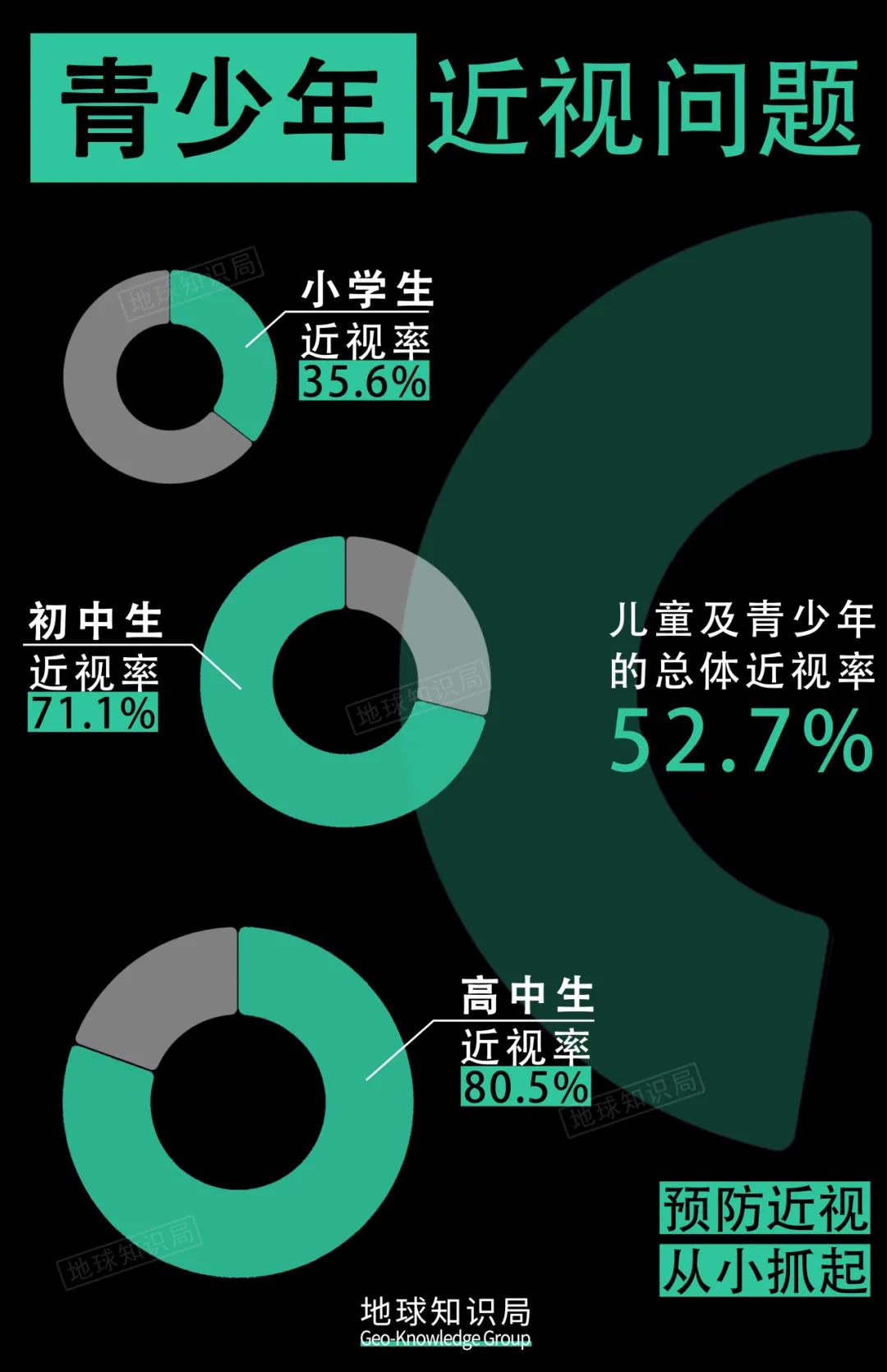 这是大家的直观感受,我国近视发病率也呈现出不断上升的趋势,尤其是青少年群体的近视率居高不下。根据最新的数据,我国儿童及青少年的总体近视率为52.7%,其中小学生为35.6%,初中生为71.1%,高中生为80.5%。这一数据显示了近视问题在我国青少年中的普遍性和严重性。