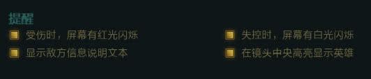 提醒推荐全部点满,如果你的镜头移到其他位置,被攻击时会收到提示。高亮显示英雄就是按住空格会在自己英雄的头上显示标记,尤其是在团战中效果显著,新手玩家最好点上。显示敌方信息说明文本的效果是,鼠标移动到野怪等生物上时会显示说明,可以帮助玩家熟悉野区,推荐新手点上。