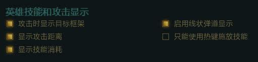 显示目标框架意思是右键点击英雄,同样可以在左上角显示敌方属性。启用线状弹道影响常规施法时弹道的显示,如卡牌的Q,不开的话只是圆圈,开了的话是三条线,方便瞄准。显示攻击距离,如果对攻击距离的把控比较准确可以不点,关掉后A键就不显示攻击范围了。热键释放技能就是不能用鼠标点技能了,防止误触。技能消耗必点,计算蓝量非常关键,是高手必备的能力。