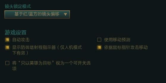 防御塔射程指示推荐新手点一下,方便熟悉塔的攻击范围,熟悉之后塔外消耗或者极限逃生都非常有用。依据鼠标指针攻击移动,就是你的攻击移动会优先判定离鼠标近的单位,不点就是判定离英雄近的单位,实际操作一下就明白了,后文还会提到。以英雄为目标视为开关,就是你按了那个键之后就选不到除了敌方英雄之外的东西了,防止追杀不忘拆塔,后面讲到走A设置的时候会提到。