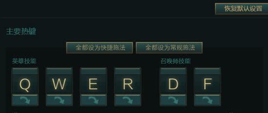 接下来就是和操作关系最大的键位环节,此界面可以自行调节键位和施法方式,不满意的话右上角可以恢复默认,QWER下面的小箭头可以单独调节是否为快捷施法。施法方式分为快捷施法和常规施法,下面稍微介绍一下他们之间的区别。