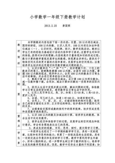 教学安排是计划的核心部分,划分学期为阶段性单元,如每月一个主题(如“几何图形”或“数据统计”),规划每周课程表,包括: